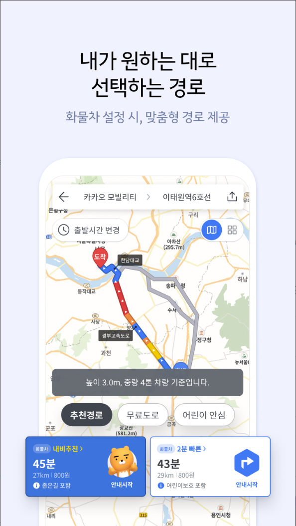 언제 출발해야 덜 밀릴지 고민하지 마세요! 출발 시간에 따라 목적지까지 얼마나 걸리는지를 빅데이터와 교통 예측 알고리즘을 기반으로 알려 드려요.