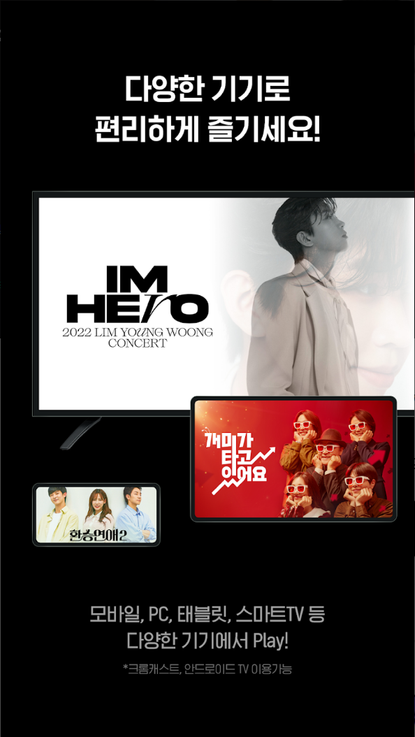 티빙에서만 볼 수 있는 오리지널과 최신 인기 TV 프로그램, 영화, 해외 시리즈, 스포츠까지, 다양한 화면에서 즐길 수 있고, 스마트폰, 태블릿, PC, 스마트 TV, 그리고 안드로이드 TV와 크롬캐스트 기능으로 티빙을 시청하실 수 있습니다.