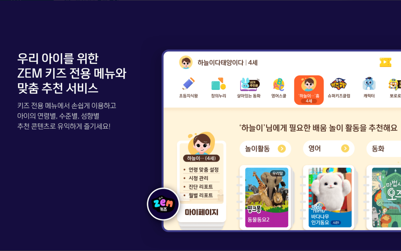 ▶ 우리 아이를 위한 ZEM 키즈 전용 메뉴와 맞춤 추천 서비스