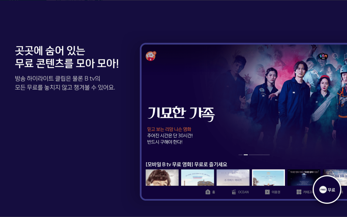 영화, 드라마 등 B tv의 무료 콘텐츠를 모바일 B tv ‘무료’ 메뉴에서 편리하게 시청하세요
